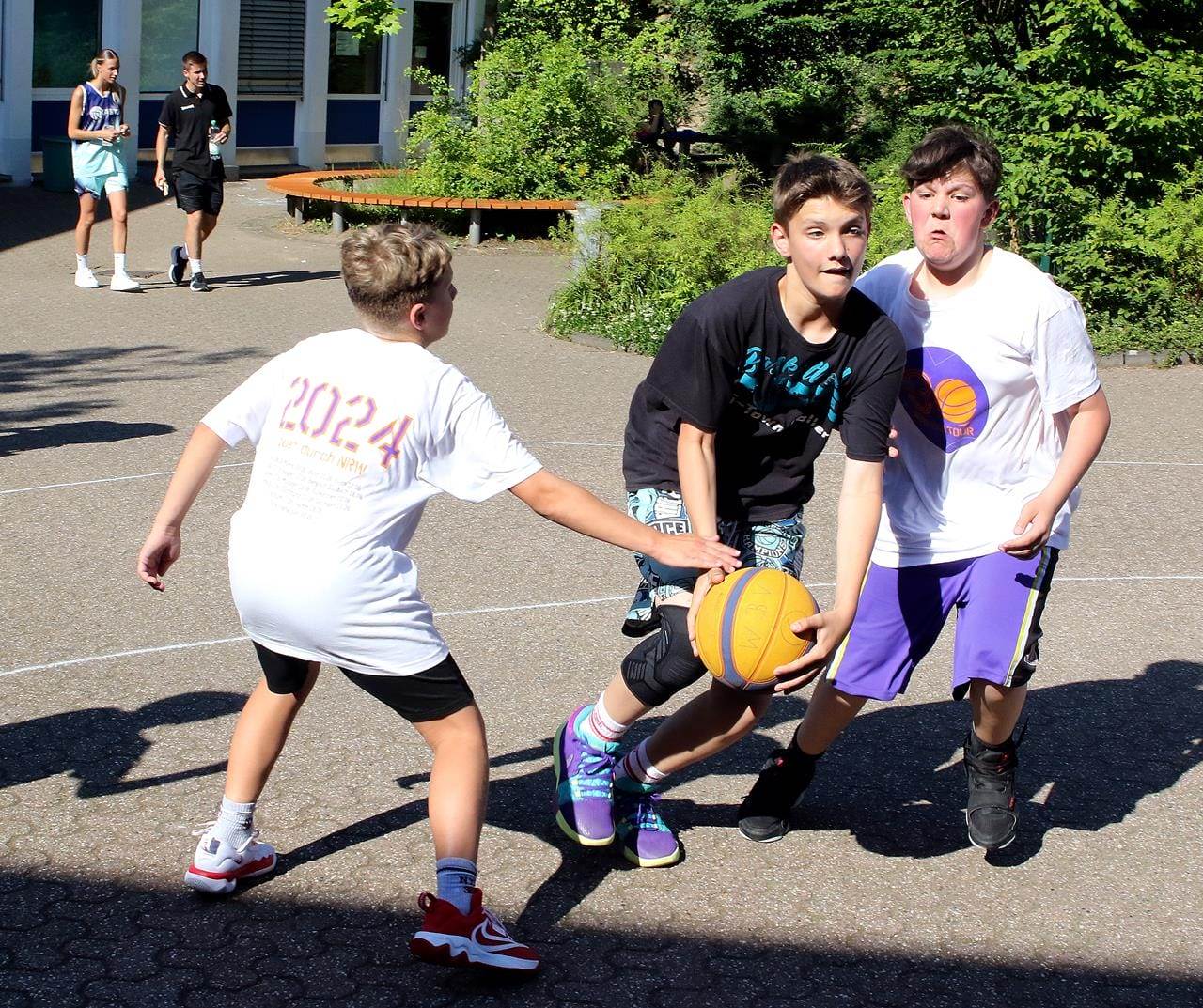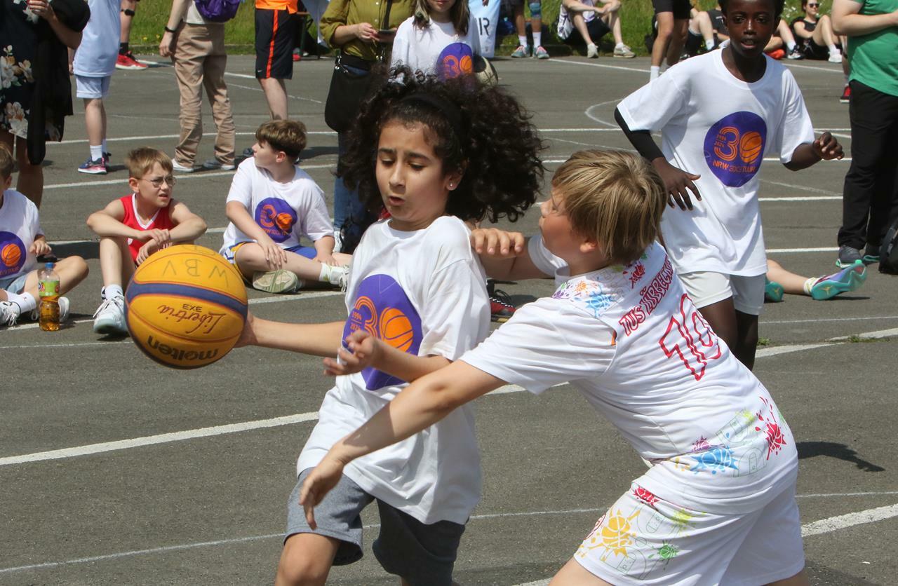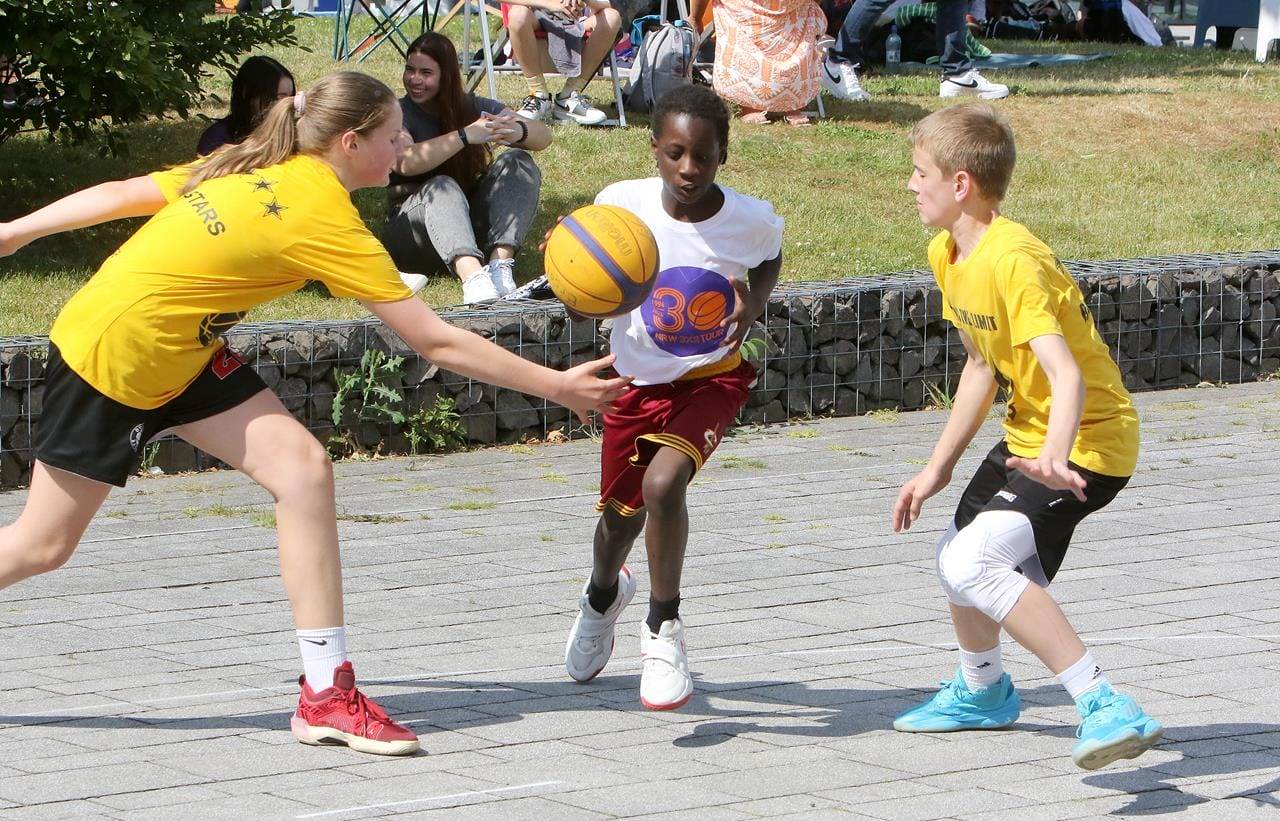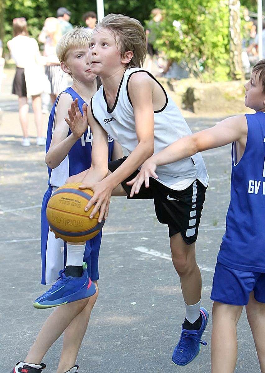 30 Grad Celsius, leichter Wind, ab und zu bewölkt, viel Schatten, Wassersprenkler-Anlage, Eisverkauf – am Schulzentrum in Gerthe konnten es die 95 Teams trotz Hitze gut aushalten und wurden vom Team des TV Gerthe hervorragend betreut und verköstigt. So entstand ein tolles Basketball Sommerfest, bei dem die vorletzten Tickets für das Finale in Recklinghausen ausgespielt wurden.