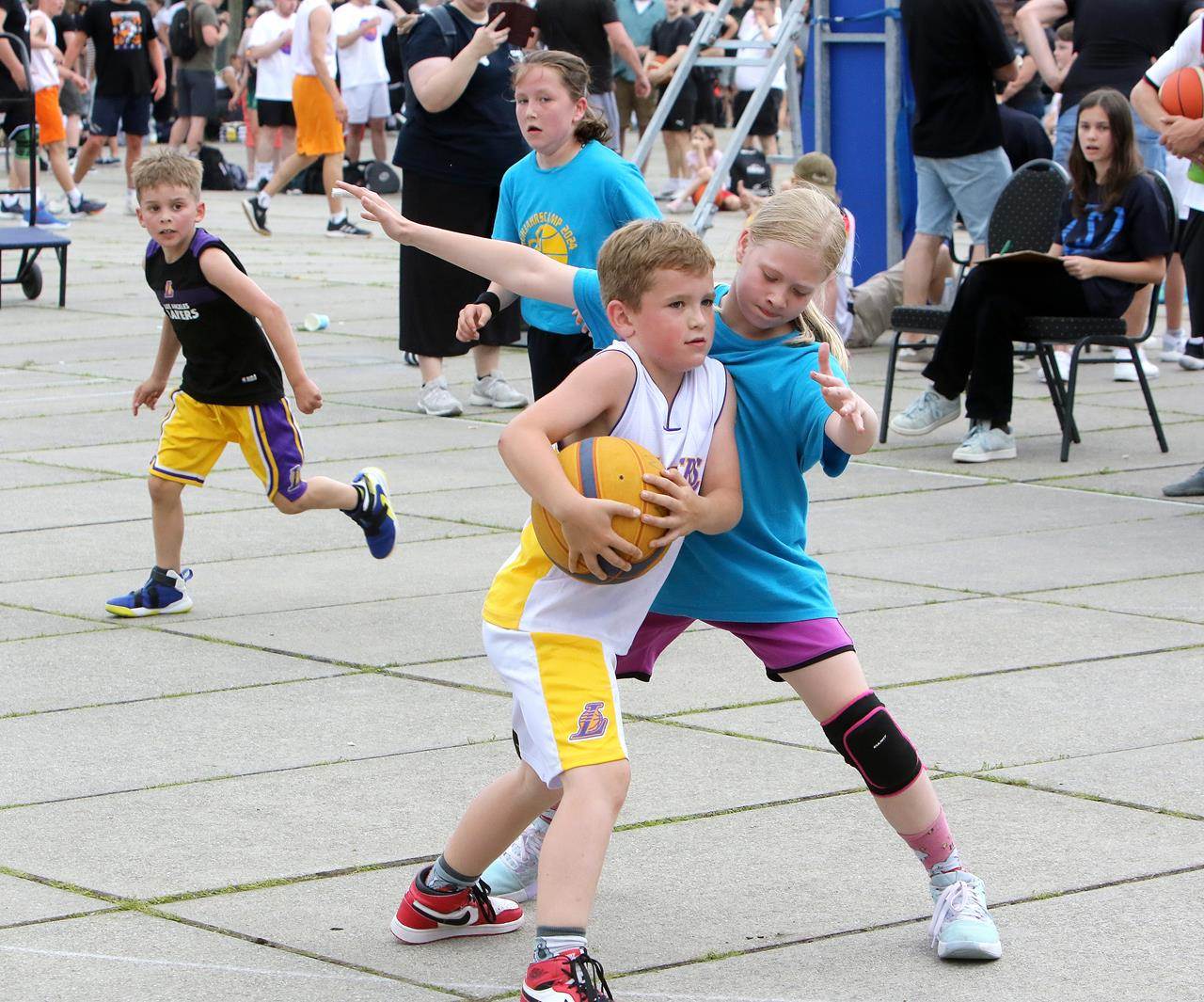 Rund 400 Basketballer*innen in 152 Teams und rund 300 Zuschauer*innen tummelten sich am Sonntag, den 23.06.2024 auf dem Phoenixplatz in Dortmund. Das Organisationsteam um Malte Hoffmann vom TVE Dortmund Barop hatte einiges zu tun, die rund 30-40 Helfer*innen halfen bei Auf- und Abbau, beim Courtwatchen oder beim Kuchenverkauf, bzw. Grillstand. Das Turnier wurde bereits am Donnerstag Abends als „ausverkauft“ verbucht, zum ersten Mal in der 30- Jährigen Geschichte der NRW-Tour. 15 statt der 13 Courts wurden aufgebaut, um den 150 Teams ausreichend Spielmöglichkeiten bieten zu können. Ohne vorzeitige Schließung der Anmeldemöglichkeit hätten es zu einem neuen Tour-Rekord (mehr als 172 Teams) kommen können. Das Telefon der NRW-Spielleitung stand im Vorfeld nicht still! Das hätte jedoch den Rahmen in Dortmund gesprengt, gerade weil viele TeilnehmerInnen und Helfer*innen zum Fußball EM Spiel Deutschland-Schweiz wieder zu Hause sein wollten. Der 1. Bürgermeister der Stadt Dortmund betonte bei seinen Grußworten jedoch, dass es am heutigen Tage um Basketball geht und das sei auch gut so! Auch Hermann.Josef Lemke-Bochem war begeistert von der großen Basketball-Arena auf dem Phoenixplatz. Andreas Muth, 1. Vors. und Andreas Gövert, 2. Vors. des Vereins TVE Dortmund Barop bedankten sich bei ihren ehrenamtlichen Helfer*innen des Vereins für die Unterstützung. Schulausschussvors. der Stadt Dortmund, Britta Gövert, nahm die ersten Würfe am Court und eröffnete so die Veranstaltung.