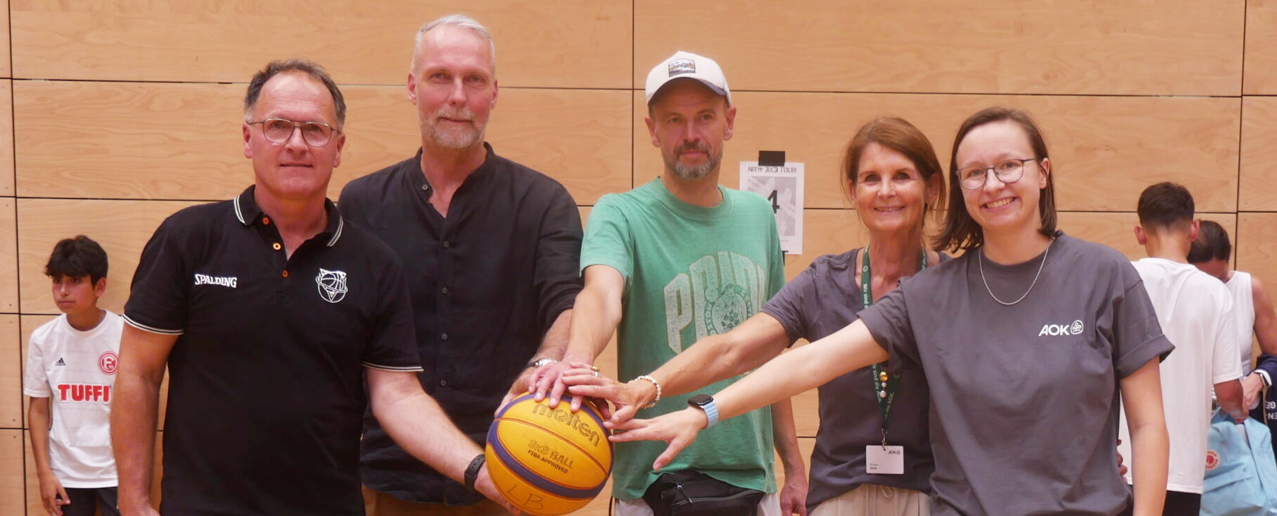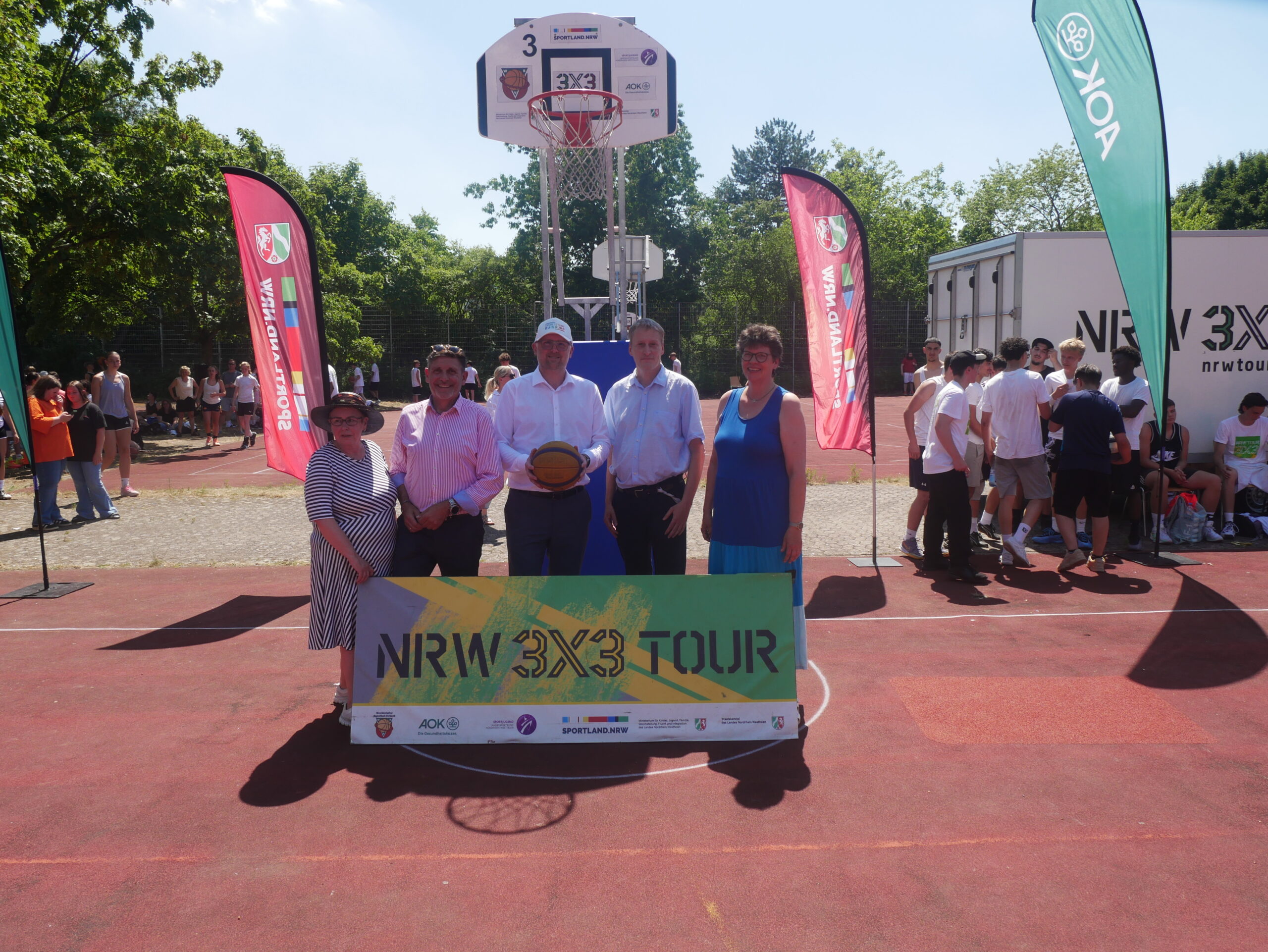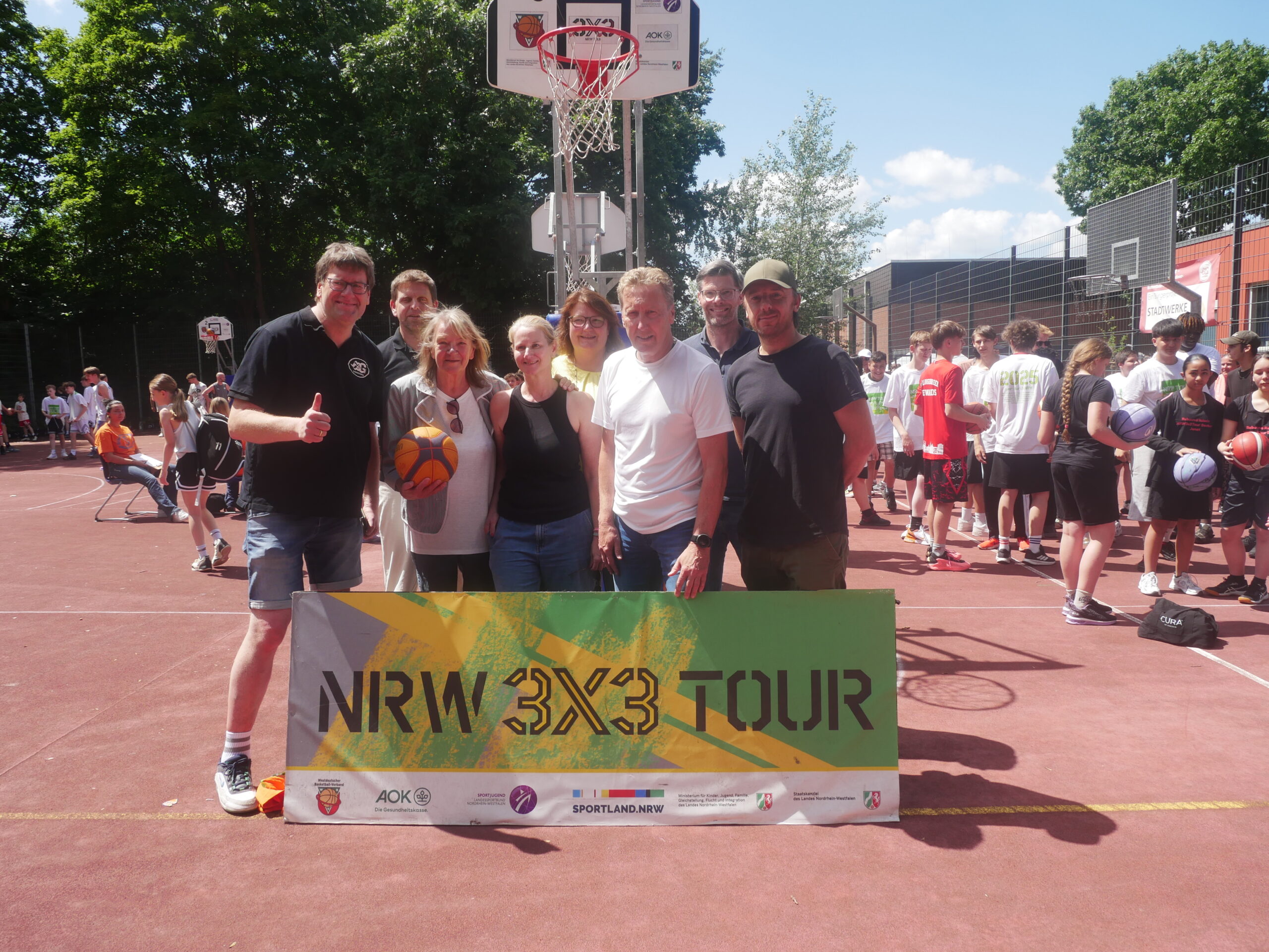 Das Finale der Streetbasketball-Tour in Recklinghausen war ein großer Erfolg. Die Ehrengäste eröffneten die Veranstaltung mit Freiwürfen, von links: Daniel Skakavac (stellvertretender Vorsitzender der Sportjugend NRW), Hermann-Josef Lemke-Bochem (Teamleiter Prävention AOK NordWest), Melanie Edward (Vizepräsidentin WBV Breitensport/Schule), Carmen Plischke(Staatskanzlei NRW, Abteilung Breitensport), Uwe Plonka (Präsident WBV), Jonas Bredeck (Vorstand Finanzen Citybasket Recklinghausen) umrahmt von den Cheerleadern Citybasket Recklinghausen